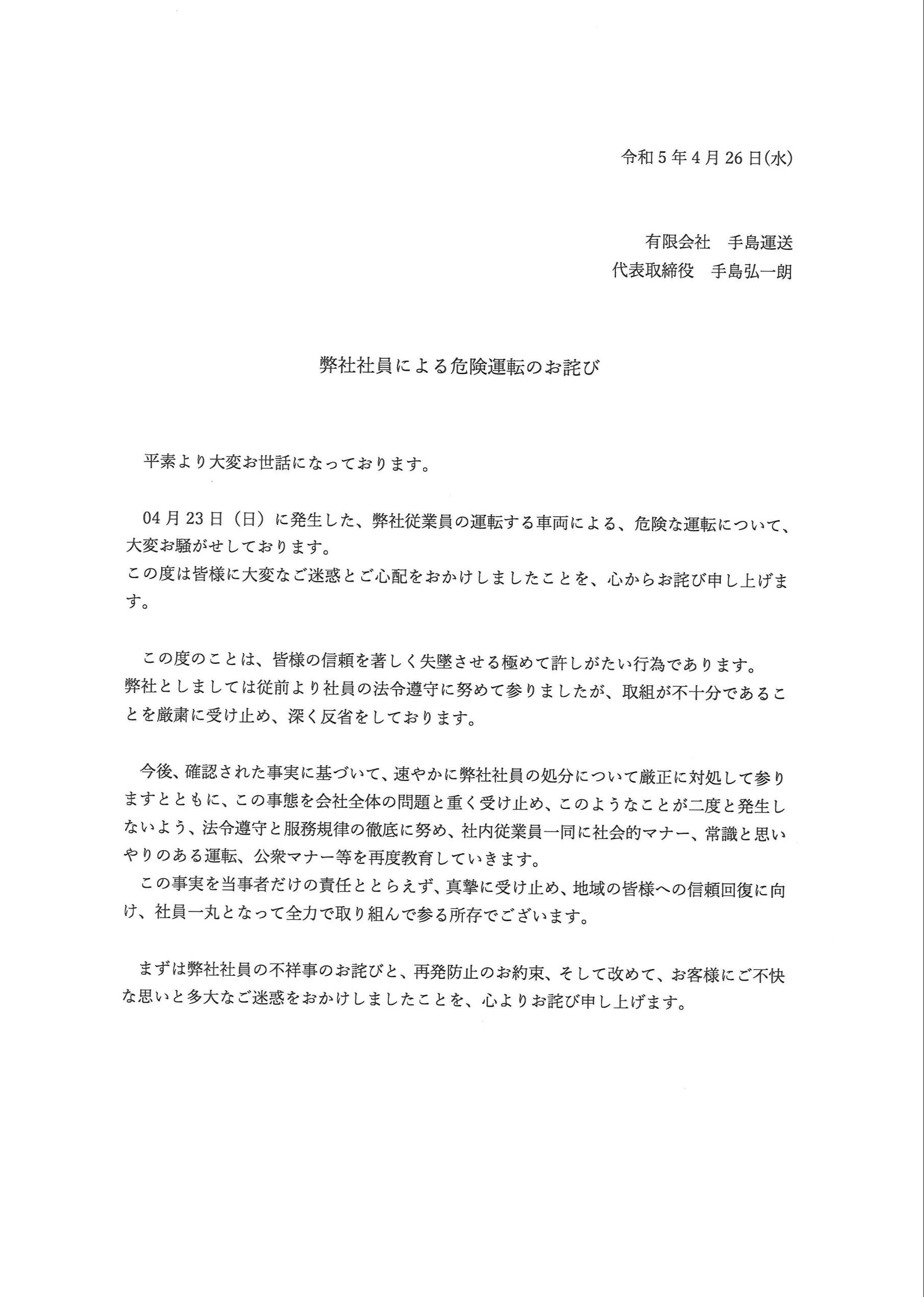 04月23日(日)に発生した、弊社従業員の運転する車両による、危険な運転について、大変お騒がせしております。